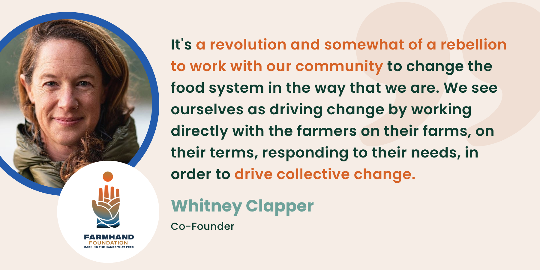 That’s why there’s a place for Farmhand Foundation. That’s why our goal is to work in harmony and unity. It’s a revolution and somewhat of a rebellion to work with our community to change the food system in the way that we are. We see ourselves as driving change by working directly with the farmers on their farms, on their terms, responding to their needs, in order to drive collective change. Our work is truly building this more resilient kind of regenerative, long-term approach to a regional agricultural system that can then become a model for other communities to do the exact same thing.